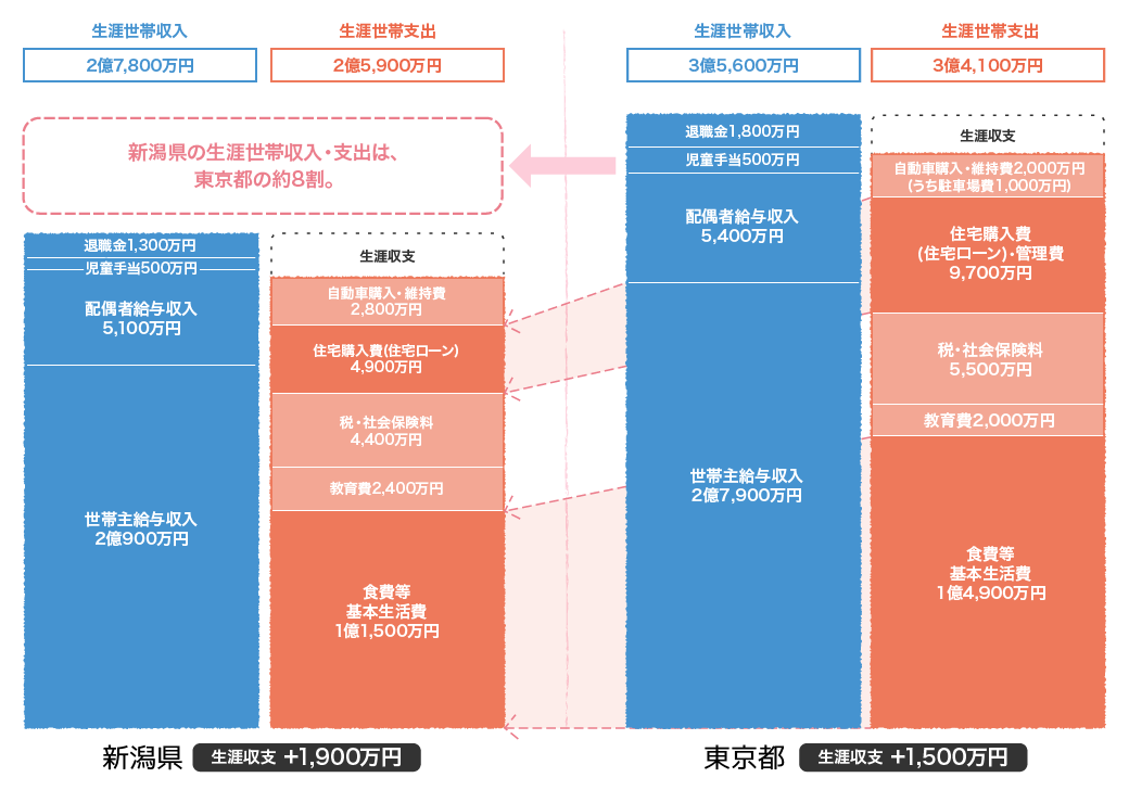 東京での生活と比較すると、新潟の収入は8割程度であるものの、食費などの基本的な生活費や住宅購入費が低いため、生涯収入と支出の差(収支)に大きな違いはありません。